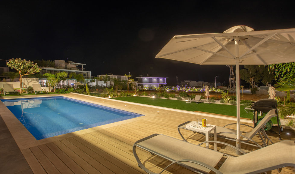 As you walk in to the villa, you will find the open-plan living room, kitchen and dining area. The living room has comfortable sofas, widescreen TV with satellite channels and free WI-FI connection. The modern kitchen is fully equipped with all appliances you need for your self-catering stay as well as a breakfast bar. The ground floor is surrounded by bi-fold patio doors which open up to lead you to the generous landscaped private garden and pool/BBQ/kitchen area outside.